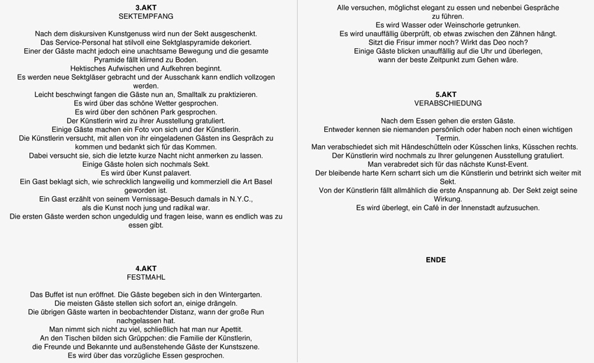 Die vermeintlich spontane und intuitive Interaktion der Besucher miteinander scheint nun einer dramaturgischen Anweisung zu folgen: Vom Händeschütteln bis hin zum Smalltalk und dem unauffälligen Blick auf die Uhr. Es geschehen aber auch ungewöhnliche Dinge, wie zum Beispiel das Umwerfen der Sektglaspyramide durch die unachtsame Bewegung eines Gastes. Passiert dies wirklich unabsichtlich oder ist das eine inszenierte Handlung, weil das eine im Programmheft beschriebene Situation ist? Sind die Reaktionen auf dieses Malheur authentisch oder gespielt? Die Grenze zwischen Fiktion und Realität verschwimmt, das Urheberrecht einer Handlung wird in Frage gestellt: entspringt die Handlung einer subjektiven Motivation heraus oder ist es die Ausführung der im Programmheft beschriebenen Handlungen?